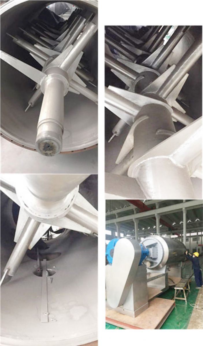 The equipment body is horizontal cylindrical type, and the two ends are supporting frame, sealing and transmission system. The cylinder is divided into three parts: the inner tank, the jacket and the insulation layer. The structure of the machine mainly includes stirring jaws, inner shaft heating using rotary joints in and out, drying cylinder, heat source inlet, condensate drain, sealing end cover, uniform speed transmission device, safety valve, vacuum port, feeding port, pressure gauge, Pneumatic discharge port, intelligent control box, pulse dust collector and other components. The horizontal structure of the whole machine, all equipment components are integrated on the steel frame, and the heating medium can be hot water, steam or heat transfer oil. The overall design is reasonable, the structure is compact, and the whole machine runs smoothly and stably.